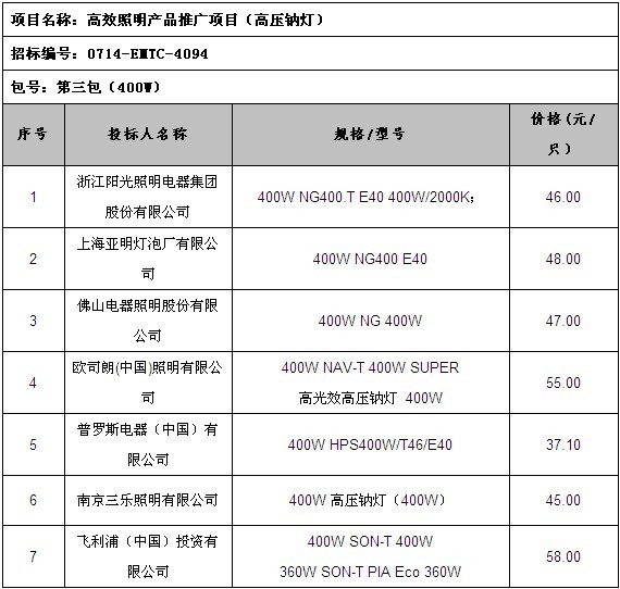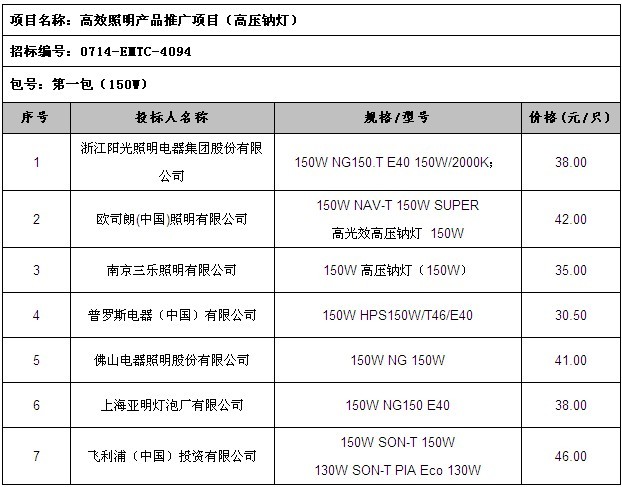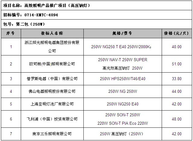 高效照明產(chǎn)品推廣項(xiàng)目(三基色高頻雙端熒光燈及支架)中標(biāo)入圍結(jié)果公示 高效照明產(chǎn)品推廣項(xiàng)目(普通照明用自鎮(zhèn)流熒光燈)中標(biāo)入圍結(jié)果公示 高效照明產(chǎn)品推廣項(xiàng)目(高壓鈉燈)招標(biāo)公告 高效照明產(chǎn)品推廣項(xiàng)目(三基色高頻雙端熒光燈及支架)招標(biāo)公告