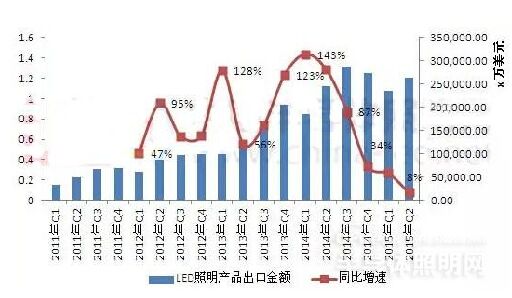 CSA Research對海關(guān)出口數(shù)據(jù)整理可得2015年第1季度上半年出口總額為25.450億美元,較2014年第4季度上半年增加7億美元,同比增加16%。實(shí)際上,從2011年至2014年,在我國整體外貿(mào)出口逐漸萎縮的狀況,LED照明產(chǎn)品出口一枝獨(dú)秀,一直保持超過30%的超高速增長。 2014至2015年我國LED照明產(chǎn)品的出口增速較2011年至2013年來有所緩和,從2011年1季度的3.4億美元到2014年第1季度的27.64億美元,出口總額幾乎翻了3番。但自2014年第2季度開始,出口增速開始呈現(xiàn)懸崖式下滑, 2015年第2季度,出口總額達(dá)到26億美元,出口增速為8%。
