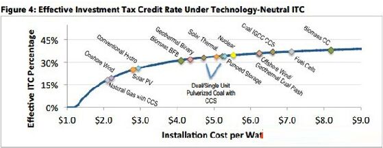 近日,美國一份最新出臺的與光熱發(fā)電行業(yè)發(fā)展密切相關(guān)的投資稅收抵免政策(ITC)提案建議:從2016年底要再次提高光熱發(fā)電項目的投資稅收抵免政策的補貼額度。 而根據(jù)此前奧巴馬政府的2015財政預算,ITC政策在2016年到期后將被廢除,以生產(chǎn)稅收抵免(PTC)政策予以代替,屆時光熱發(fā)電項目獲得總投資補貼的額度將從30%降至10%。 上述新的ITC提案是由AmitRonen提出的,曾作為參議員MariaCantwell副辦公室主任的他于2008年制定了為期8年的ITC政策。目前,任職華盛頓大學太陽能研究所主任的AmitRonen正在建議國會重新考慮可再生能源政策,但是他擔憂太陽能行業(yè)所追求的ITC政策的短期延期不太可能獲得立法許可。 Ronen和JamesMueller共同編撰的《太陽能軟著陸:做出正確選擇以避免ITC政策懸崖》一文提議,國會不應該再像此前那樣制定一刀切的ITC政策,而是要站在技術(shù)路線中立的角度來制定ITC政策,該政策應基于技術(shù)規(guī);统墒旎箜椖砍跏及惭b成本下降的幅度和趨勢來制定,因此不同的技術(shù)路線將會享受不同的ITC補貼額度。按照該提案建議的思路,光熱發(fā)電項目的ITC補貼額度應高于光伏項目,因為目前只有很少一部分光熱發(fā)電項目獲得了開發(fā),還根本沒有實現(xiàn)規(guī)劃化效益。 如下圖所示,在當前的成本條件下,光熱發(fā)電技術(shù)的ITC補貼額度應超過30%,而光伏發(fā)電技術(shù)則應低于30%。