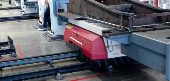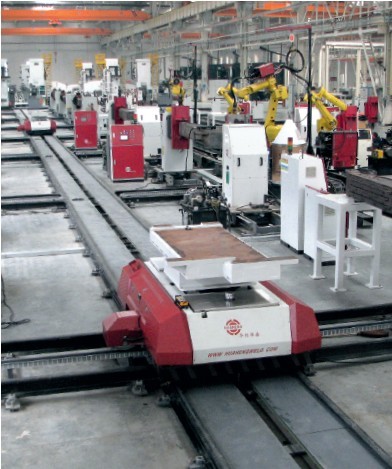 RGV 小車在三一臨港生產(chǎn)基地的結構件焊接車間中用于全自動生產(chǎn)挖掘機挖斗和動臂