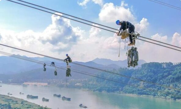 廣東電網(wǎng)能源發(fā)展有限公司的高空作業(yè)人員進行跨越西江段的間隔棒安裝